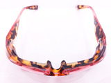 目を引く フロント レンズの入る輪の部分には くっきりとした赤 の塗装 さらにさらに 反りかえった ブリッチ部分は 前からも横からも 印象的ですよ そして テンプルは 独特な 白 茶色 透明 の セルを 使用しております セルの柄 だけではなく テンプルのデザインも 曲線美 を感じますね ですが、 美しさ だけではなく かなーり広がる バネ蝶番を しようしていますので 掛けやすさも抜群 です そして |