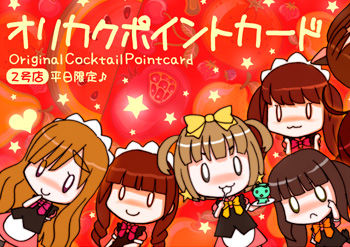 よいことなので許してくださいw ) 2 号店 で 【 平日 】に オリジナルカクテル をご注文くださった方 には、 1人のメイドのオリジナルカクテルにつき 1 ポイント 差し上げます♪ 【10ポイント】 集まると、 メイドのコメントシート を プレゼント (^^) ♪ 期限は特にありませんが、コメントシートはゆっくり(←)更新されていきます♪ (特に告知はありません^^) 今までにちょっとおまけが プラス |