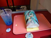 Project DIVA-X HD」とのコラボレーションロールケーキとドリンクが販売されている 同商品は、メロン風味のクリームと生クリームを使ったロールケーキに初音ミクをプリント。 1点購入につき、缶バッジ(57ミリ)を1個進呈する。 |