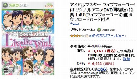 アニメDVD付き「アイマスL4U!」がアマゾンで約7割引に! :にゅーあきばどっとこむ アニメDVD付き「アイマスL4U!」がアマゾンで約7割引に! Xbox 360用ゲーム 「アイドルマスター ライブフォーユー!(L4U!)」の限定版 が、アマゾンで6割引で販売されていることを以前紹介した。 |