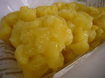 [タルト生地]4の生地に打ち粉をふって麺棒で型より大きめに伸ばす 9.型にあわせて8の生地をおき、底から縁にかけて丁寧に押しいれる 10.フォークで底辺に空気穴をあける 11.再び冷蔵庫で1時間位寝かせる 12.重石をのせ、180℃のオーブンで10分、重石を外して10分、きつね色になるまで焼く 13.タルトに7のフィリングを平らに入れる 14. |