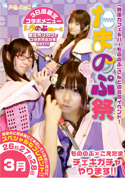 ☆内容発表☆ その① 「戦国メイドカフェ&バーもののぷ」さんとの制服交換 その② チェキガチャガチャ(戦国衣装にコスチュームチェンジした こえたまちゃんチェキ) その③ もののぷカレーとこえたまのたまごを合わせた限定メニュー「たまのぷカレ~」 さらに イベント期間中はこえたまちゃん達のオリジナルカクテルがラミカくじ付きとなります いつもと違う戦国な声優のたまごにお越し下さい |