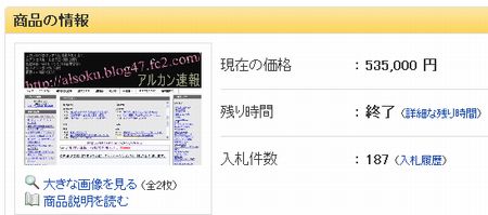 現在「アルカン速報」では早速落札者による挨拶が掲載されている ・ アルカン速報「よろしくお願い致しますsan*****と申します」 ・ アルカン速報「アルカン速報は50万くらいで落札されました。 」 ・ Yahoo!オークション「2chコピペブログ 『アルカン速報」 ■ 関連記事 ・ 2chまとめブログ「アルカン速報」がサイト売却を告知 |