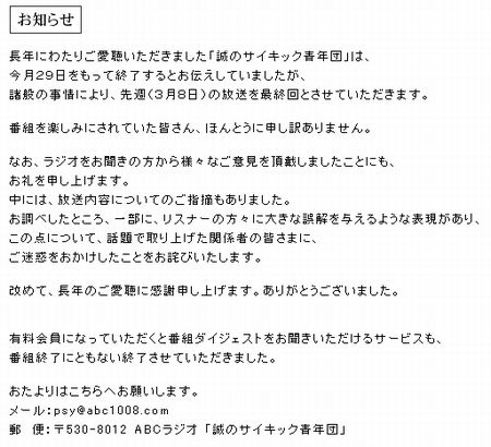 「誠のサイキック青年団」が前倒しで突然終了の異常事態 :にゅーあきばどっとこむ