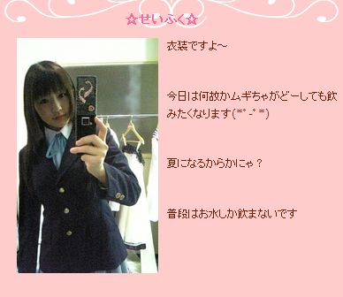 制服のコスプレ姿が見られるが、「今日は何故かムギちゃがどーしても飲みたくなります」と語っていることから、ムギこと琴吹紬のコスプレだと思われる ・ つぼみ日記「☆せいふく☆」 ■ 関連記事 ・ AV女優・つぼみ出演の「けいおん!」パロディAVが撮影中 |