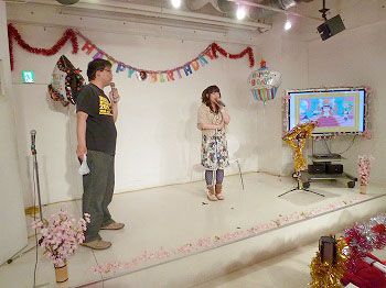 (笑) そうそう 今回もファンのみなさんが サプライズで会場の飾り付けを してくださいましたよ 桜の花がい~っぱいっ!! 様々な飾りつけで、会場がキラキラしていて とってもキレイでした みんな、ほんとにいつもありがとうっ! |