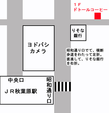 → 30mくらい真っすぐ進む → 地下への階段付のビルがあるので、その階段を降りて左が入口です 秋葉原(日比谷線)4番出口から徒歩7分 4番出口から地上に出たら橋を渡り 靖国通りまで直進し信号を渡る → さらに直進し次の交差点で斜め向かいに進み直進 → ミニストップの角まで来たら右折 駐車場まで来たら次の角右折するとすぐ入り口です JR神田北口から徒歩7分 北口出たらすぐ右へ JTBが見えたら信号 |