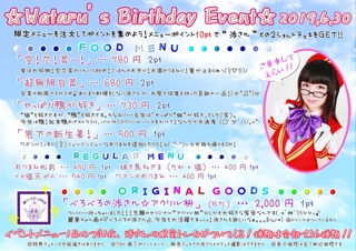 v(≧▽≦*) 初めての方もいらっしゃるかと思いますので、改めてバースデーイベントの説明をさせていただきます☆ ↓↓↓↓↓↓↓↓↓↓↓↓ イベントメニューを注文するとポイントが貯まります 10pt で渉さんと2ショットチェキが撮影できます♪ ※本日に限りTGV満了ポイントカード、販売チェキでの渉さんとのチェキ撮影はできません そして、こだわりのイベントメニューはコチラ(●ゝω・)ゞ⌒☆ ≪イベントフード |