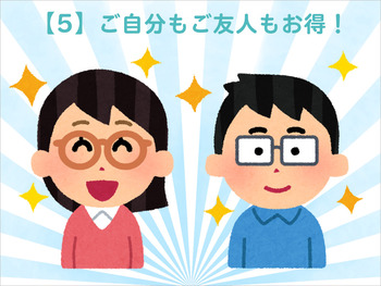 とご来店ください ▲連れてきてくださった ご友人が眼鏡一式(フレーム+レンズ1組)をご購入くださいますと… ▲すると、スーパーハイグレード(10,000円相当)のレンズを無料にいたします! ▲さらに、ご紹介くださった方は、フレーム色替えを無料でいたします! ※お手持ちの色替えしたいメタルフレームをご持参ください ※2週間ほどお時間をいただきます ▲紹介した方も、された方もお得になるというのです! |