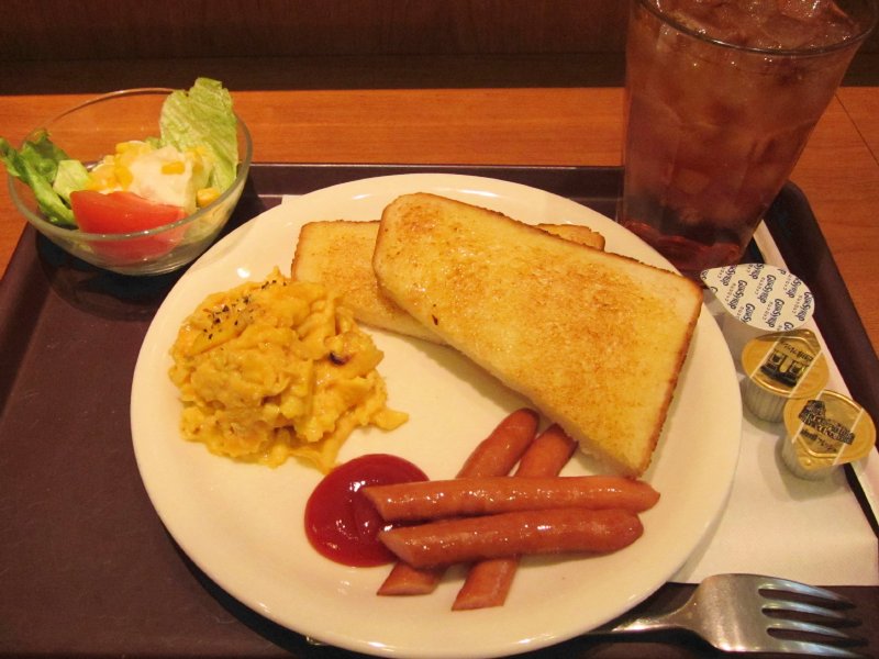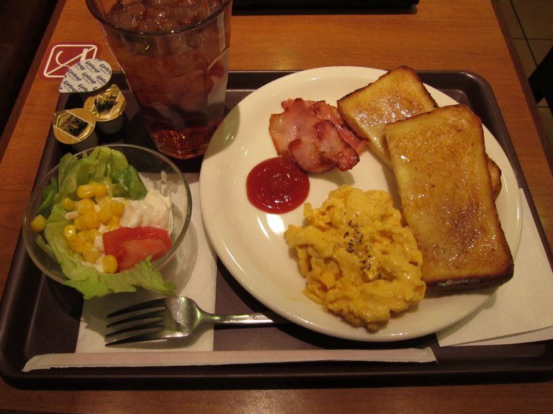 There are many breakfast sets, ranging from 380 to 490 yen. You can upgrade to a larger drink for 30 yen, and get hash browns for 60 yen.