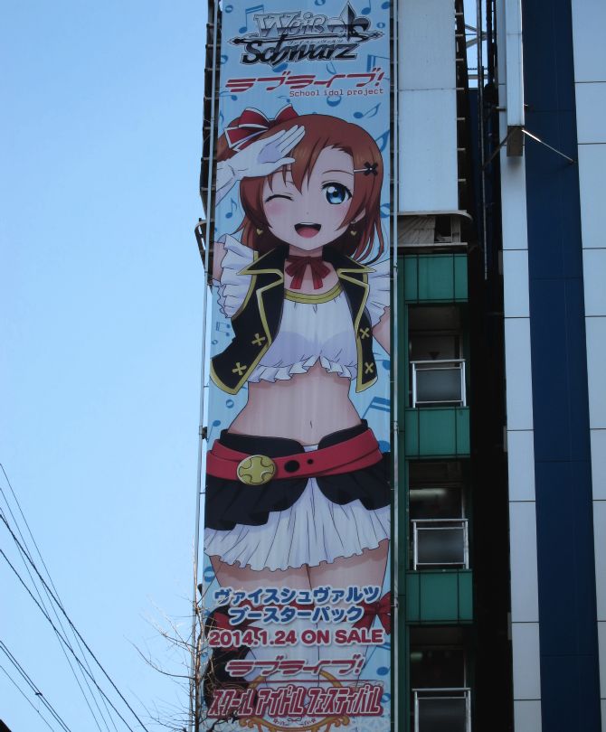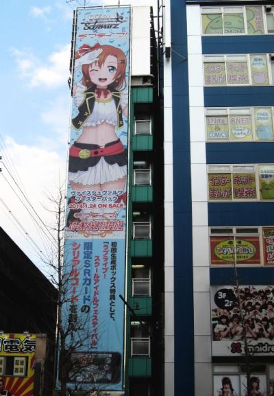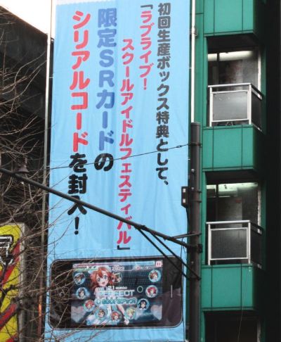 There was a very large tapestry advertisement hanging on the Medialand building for the Love Live Weiss Schwarz booster pack.