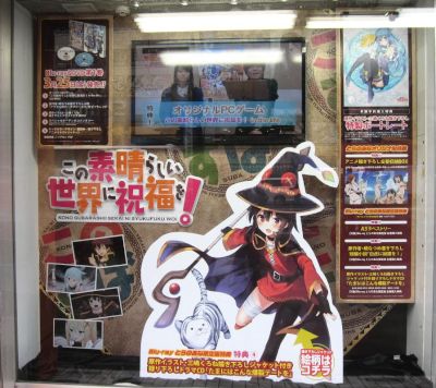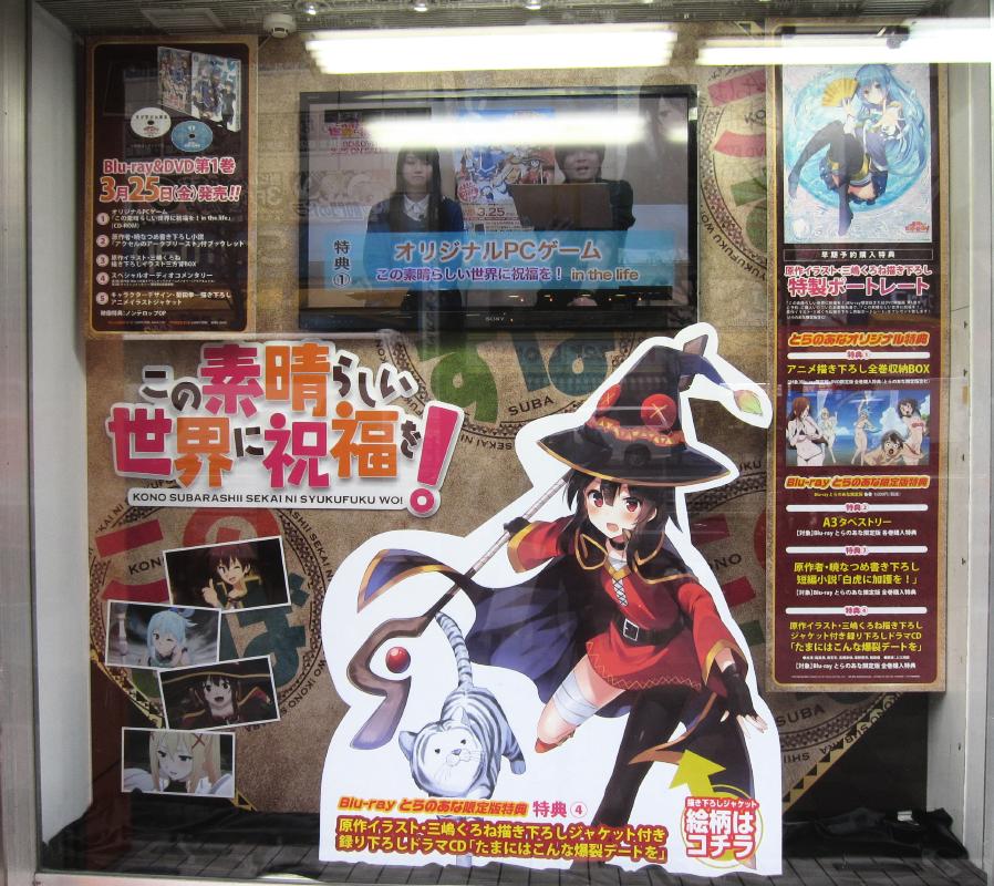 In March 2016, there was a store front window display for the Kono Subarashii Sekai ni Shukufuku wo! bluray/DVD.