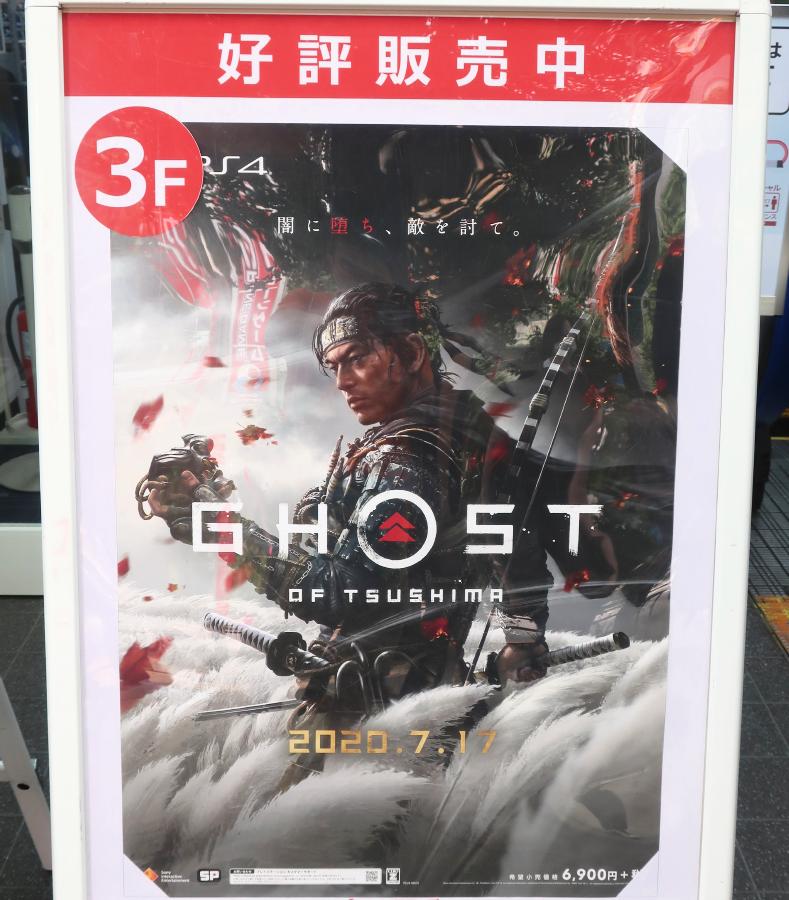 The game Ghost of Tsushima went on sale 7/17, and there was a store front advertisement on the street in front of Sofmap.