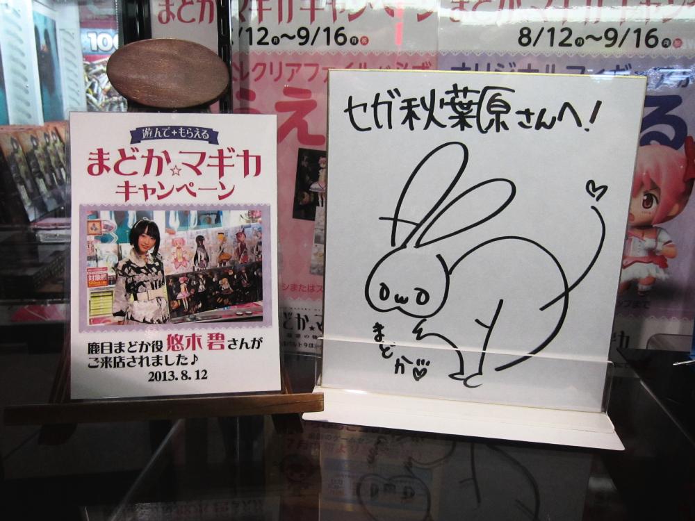 On August 12, the seiyuu for Madoka, Yuuki Aoi, went to the Sega game centers and signed some sign boards and clear files. This one was for Sega Akihabara.