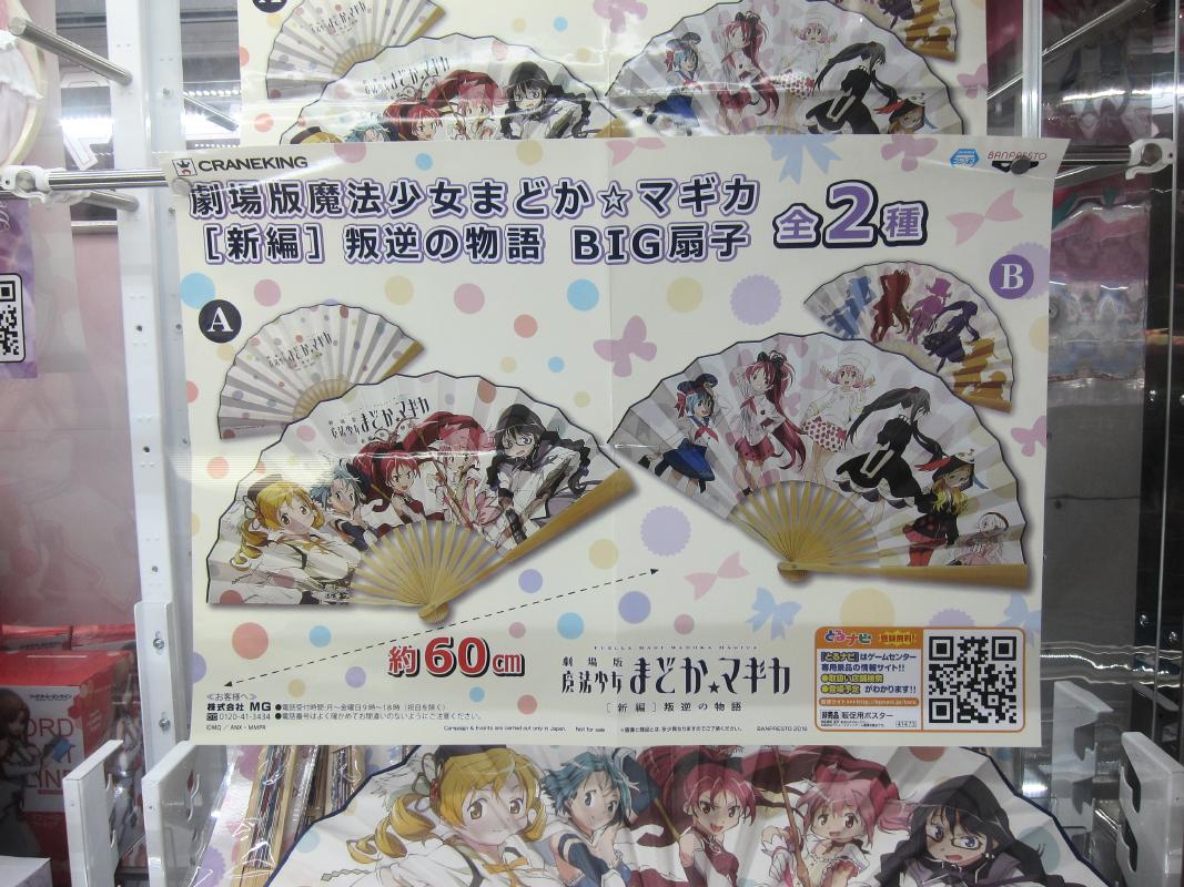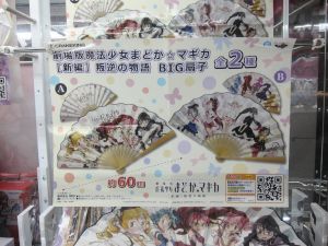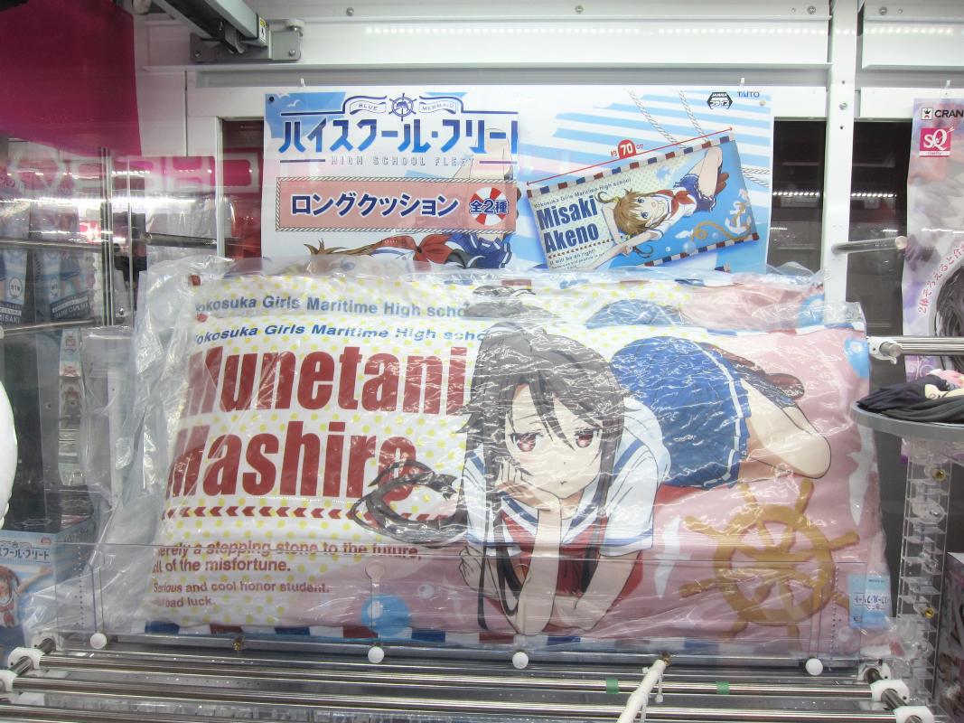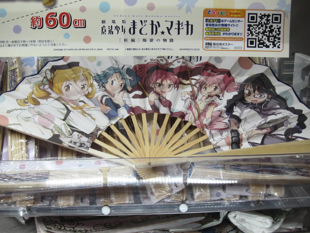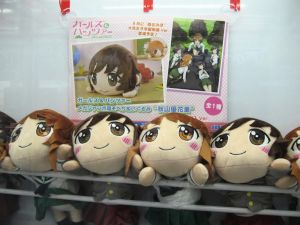 Some of the anime related ufo catcher items that were available in August 2016 are as follows: High School Fleet goods, Evangelion figure, Madoka Magica fan, Girls and Panzer doll. There were also catcher goods for Love Live, Kantai Collection, Gochi Usa, Prisma Illya, Star Wars.