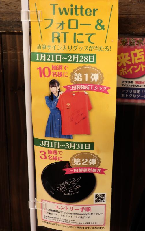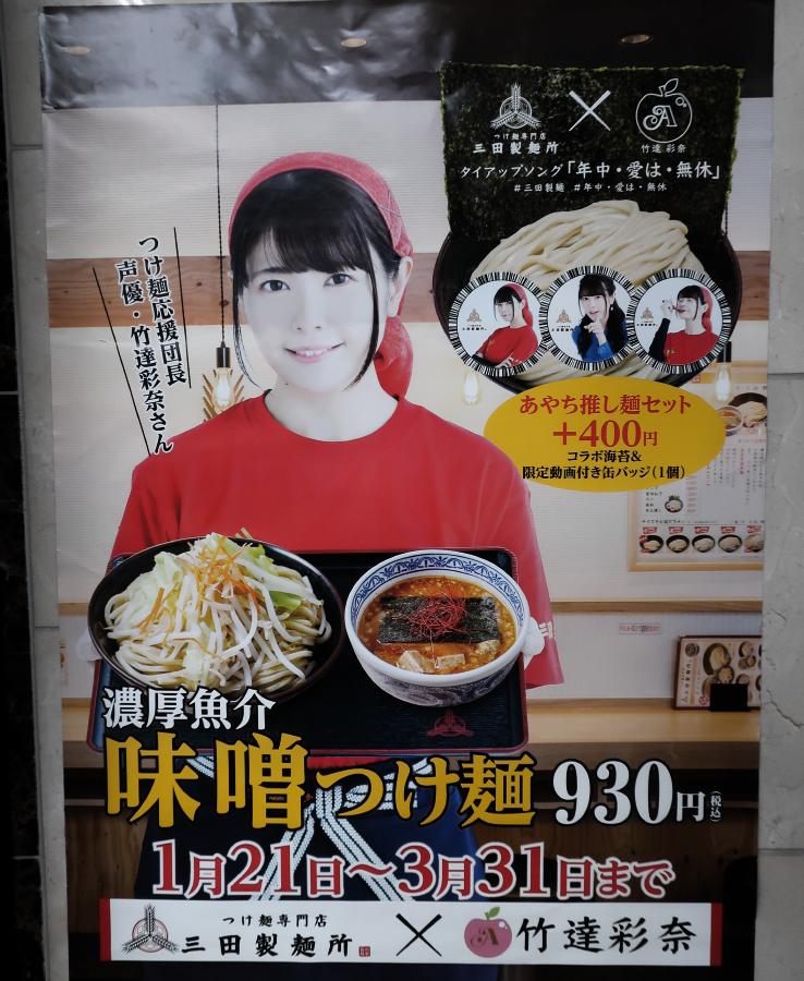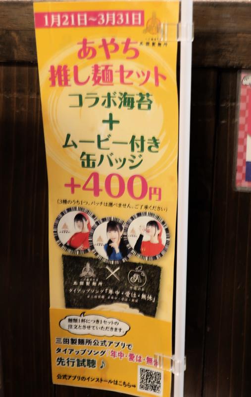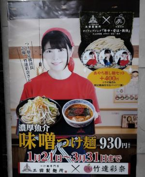 Between January 21 and March 31, 2019, there was a collaboration at the Mita Seimenjo (三田製麺所) restaurant with Taketatsu Ayana.