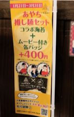 The 400 yen "Ayachi Oshimen Set" (あやち押し麺セット) was a large piece of seaweed and one random badge of Ayana, that gets added to whatever tsukemen you order.
