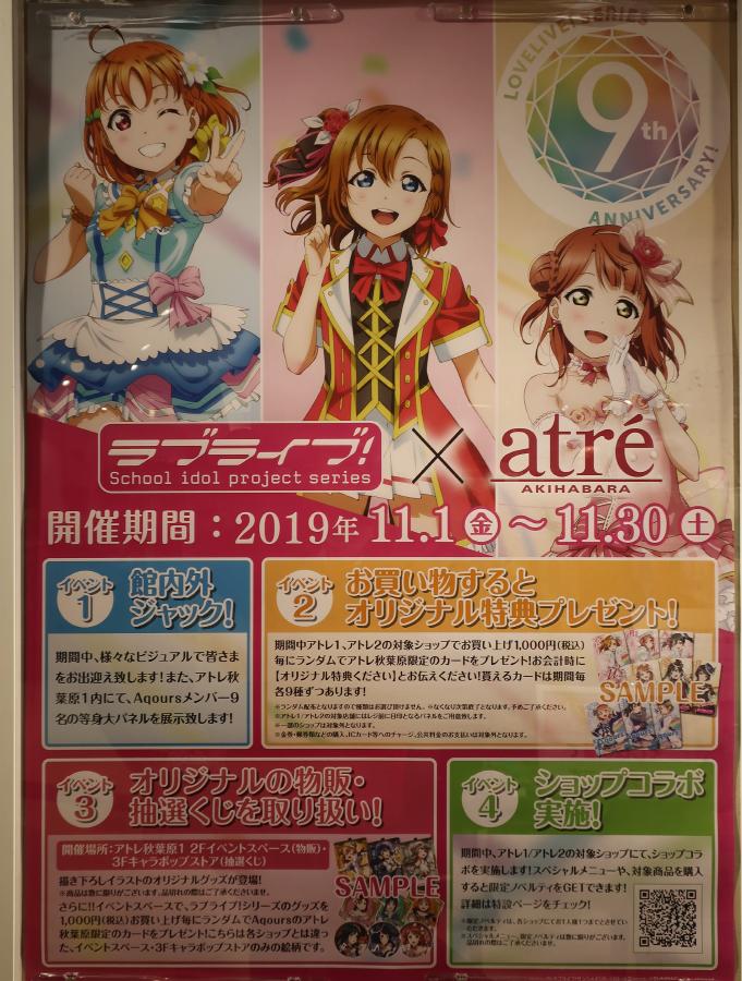 In November 2019, there was a collaboration at Atre Akihabara with the Love Live School Idol Project series. It was the 9th anniversary of Love Live. Some of the food stores on the first floor had special collaboration menus featuring the Aqours members.