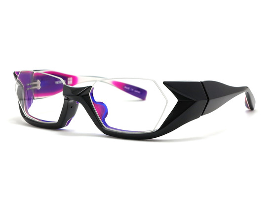 ▲お色は、【 黒・白・クリアショッキングピンク・クリアブルー 】の4色のアセテート生地を4層にして作っていただきました。クリアなピンクとブルーが重なって作られた 高発色パープルは、とても、とても、とても美しいです!写真ではお伝えしきれないので、是非現物をご覧ください~。 |