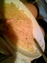 ペペロンチーノです(≧∇≦) インスタントじゃないですよ!? ちゃんと麺茹でたよ!(笑) ニンニク切ってオリーブオイルで炒めたよ!(笑) 見た目はなかなか良い感じなんですが…味がちょっぴり薄いです(>_<) うーん…何が足りなかったんだろう? ペペロンチーノは結構簡単に作れるということがわかりました!! |