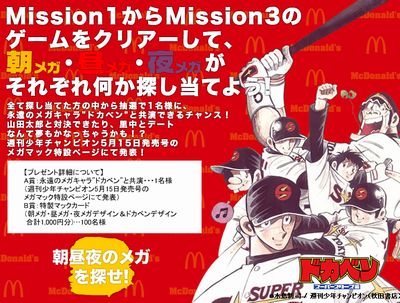 抽選で水島新司「ドカベン」に出られるキャンペーン実施中 :にゅーあきばどっとこむ 抽選で水島新司「ドカベン」に出られるキャンペーン実施中 マクドナルドが朝昼晩とそれぞれメガマフィン、メガマック、メガてりやきを販売することが話題になっている。 現在サイトでキャンペーン「朝昼夜のメガを探せ!」を行っており、ミニゲームをクリアすると、抽選で1名が水島新司さんの漫画「 ドカベン 」に出られるようだ。 |