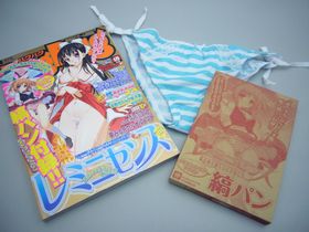 や、縞パンをデザインしたトモセシュンサク氏及び衣笠彰梧氏のコメントを掲載。 また、付録連動の「縞パン大図鑑」もあり、『美しょゲー縞パンヒロイン名鑑』『付録縞パン大解剖!!』『付録縞パン活用非公式マニュアル』などがあった 付録の縞パンは、『ヒロイン“謎の少女”がゲーム本編で履く縞パン付録!!』( 表紙 )とのことで、色はブルー、ピンク、グリーンの3色。 |