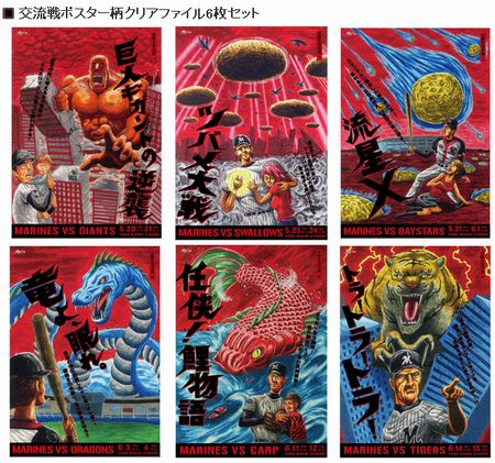 千葉ロッテマリーンズではマリーンズストアで「交流戦ポスター柄クリアファイル」6枚セットを1050円で販売する。 公式サイトではそのイラストが掲載されているのだが、奇妙なかっこよさがある ・ 千葉ロッテマリーンズ・オフィシャルサイト「ニュース」 |