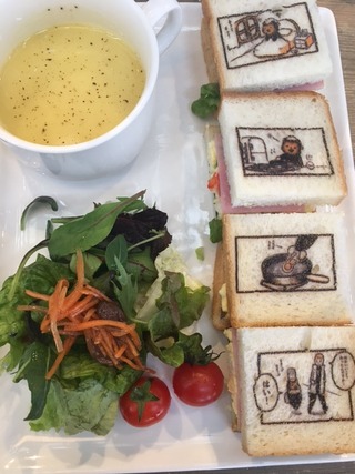 店長(こぐま)のティラミススムージー!!! これ、とても、美味しかった…!!!! アフタヌーンティーセット!見えづらいけど、店長(こぐま)の肉球型つき!! いまどき!! サンドイッチに作中の4コマが入ってるー!! |
