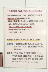 』という 掲示板が出ていました 横のクリアーBOXには A4のチラシも用意されていました 9/20までに応募して 採用されると、ノートパソコンが 貰えるそうです 有料トイレのほかに 情報コーナーや喫煙所も 併設されます トイレが有料で喫煙所が無料 なのは、タバコを吸わない自分 にとっては納得がいきませんが タバコ税で建設したり維持したりするのでしょうか 自分としては、「エキコン」のような 施設を作ってくれると |