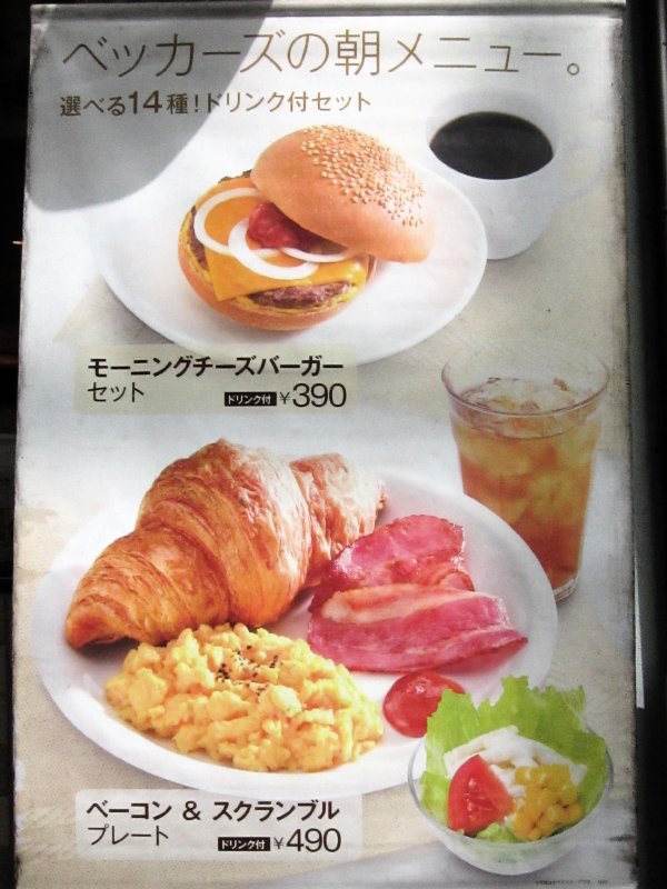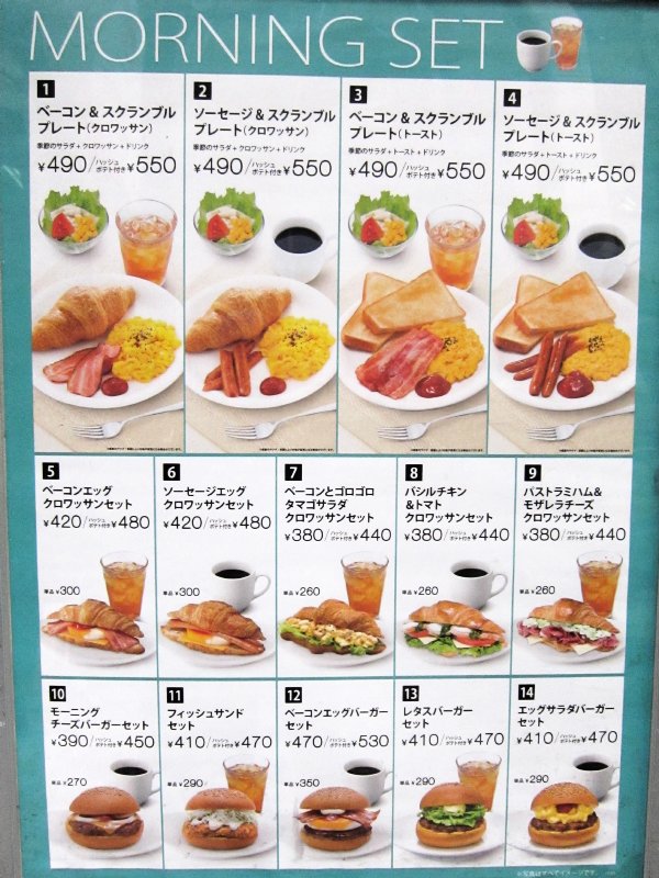 There are many breakfast sets, ranging from 380 to 490 yen. You can upgrade to a larger drink for 30 yen, and get hash browns for 60 yen.