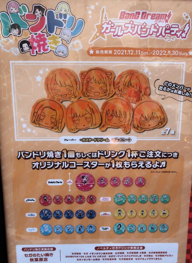 Between 12/11 2021 and 1/30 2022, there were Bang Dream character face taiyaki at Sega.